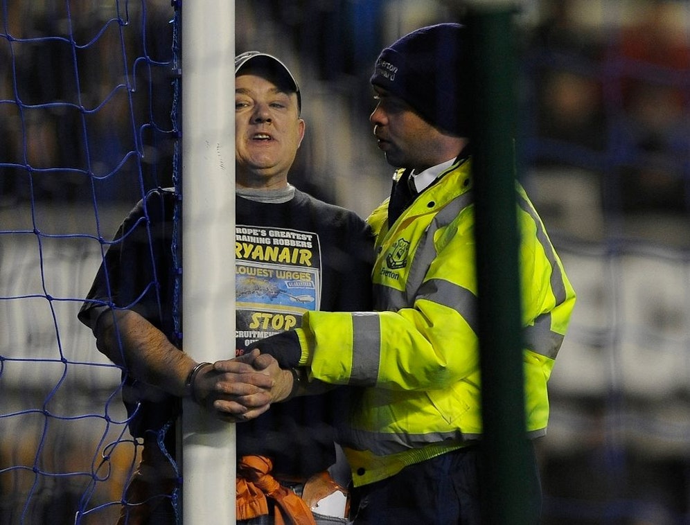 Ein 46-Jähriger Brite sorgte im Premier-League-Schlager Everton gegen Manchester City für eine kuriose Szene. Der Mann kettete sich an das Tor von City-Keeper Joe Hart.