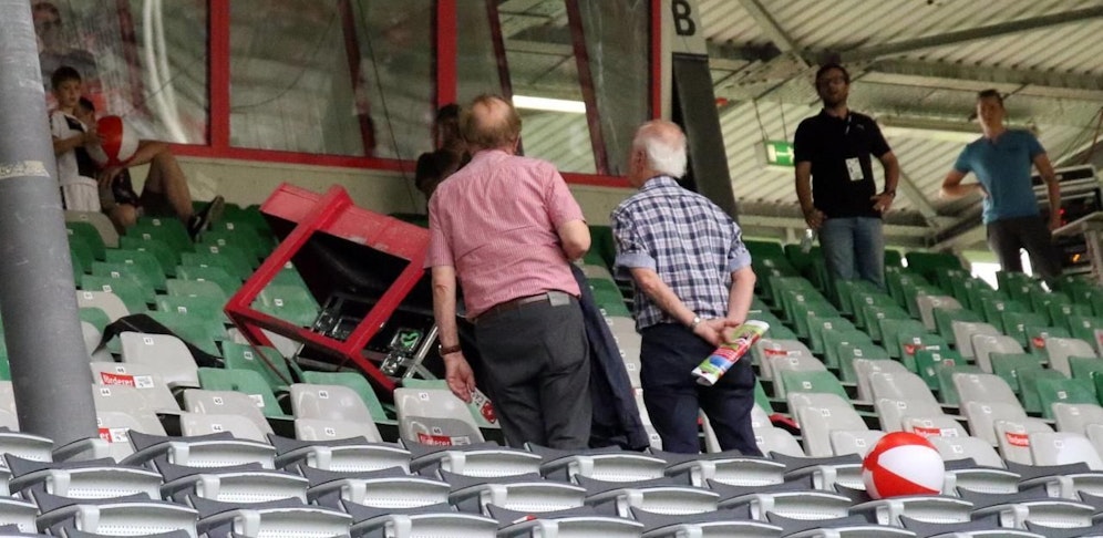 Glück für Fans bei Freiburgs Bundesliga-Sieg gegen Augsburg. Eine schwere Kiste mit TV-Ausrüstung kracht vom Dach auf die Tribüne, verfehlt Zuschauer knapp.