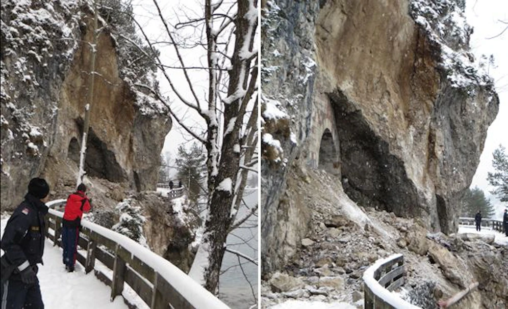 In Achenkirch, im Tiroler Bezirk Schwaz, stürzte am Achensee ein Teil der Felswand in die Tiefe, begrub einen Fußgängerweg unter sich und stürzte ins Wasser. eine Hochstromleitung und ein Abwasserkanal sind am Ufer verbaut und wurden durch das herabfallende Gestein freigelegt.