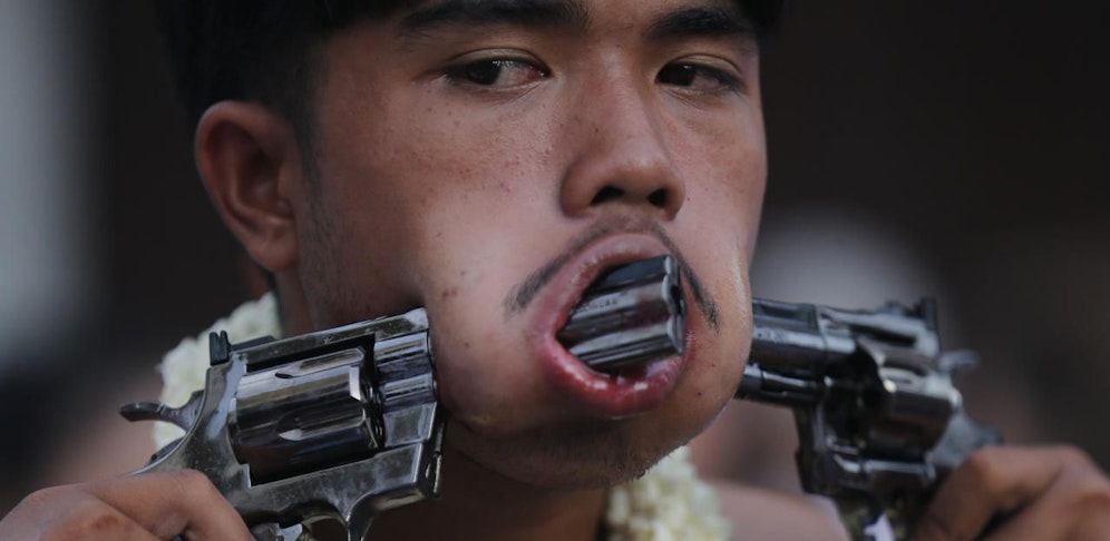 Zum Fest der neun Kaisergötter in Thailand durchstechen sich Gläubige ihre Haut mit Metallstäben und anderen Gegenständen als Zeichen ihrer Unverwundbarkeit.