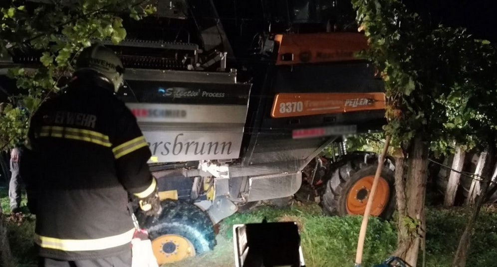 Weinernte in den Rieden bei Feuersbrunn (Tulln). Eine Lesemaschine kam von der schmalen Fahrbahn in der Kellergasse ab, steckte mit dem Hinterrad im Graben und war manövrierunfähig. Da die Zufahrt für die Fahrzeuge der Feuerwehr zu eng war, wurde die Erntemaschine vorerst mit Seilen gesichert.