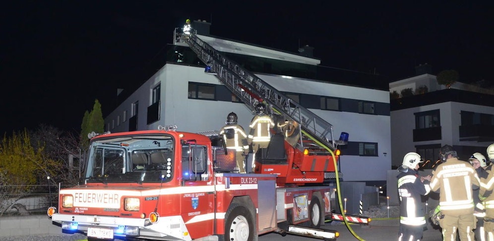 Die Florianis mussten mit der Drehleiter auf die Terrasse einsteigen. Durch die rasche Löschung konnte ein Übergreifen der Flammen auf die Fassade des Hauses verhindert werden.
