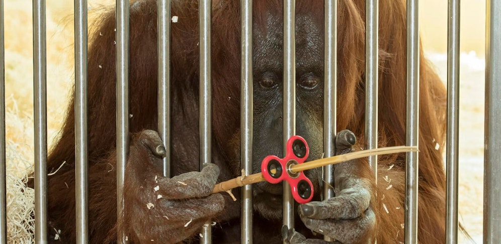 Im Tiergarten Schönnbrunn gibt es für die Orang-Utans laufend neue Beschäftigungen. Oft sind diese mit Futter verbunden, das versteckt wird. Von Bausteinen über Bälle bis hin zu Büchern, die sie zerlegen, ist alles für eine gewisse Zeit spannend. Dann verfliegt das Interesse rasch. So auch beim Fidget Spinner. Wie lange das Interesse bei den Österreichern an den Handkreiseln noch besteht, bleibt abzuwarten...