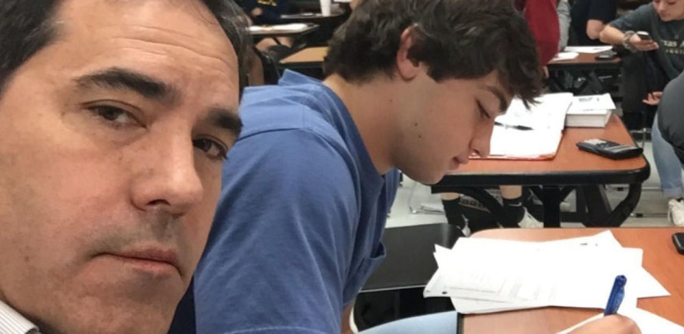 Weil er wiederholt in Physik ermahnt wurde, stellte sein Vater ihm die Rute ins Fenster. Würde noch ein weiteres E-Mail vom Lehrer kommen, hieße es gemeinsam die Schulbank drücken. Am Freitag war es dann soweit: Brad Howard wurde im Physikunterricht von seinem "alten Herren" überrascht.