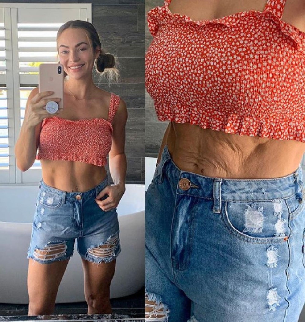 Die Influencer-Mama zeigt stolz ihren faltigen Bauch - vor allem, um dem Einfluss entgegenzuwirken, der von vielen After-Baby-Bodys auf Instagram ausgeht, die scheinbar perfekt sind und viele junge Mütter verunsichern.