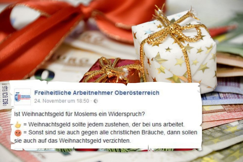 Mit einem unglaublichen Posting sorgen die Freiheitlichen Arbeitnehmer Oberösterreich für Aufregung. Sie stellten ihren Usern online die Frage, ob Muslime ein Anrecht auf Weihnachtsgeld haben sollen. Nach heftigen Protesten wurde das Posting wieder gelöscht.
