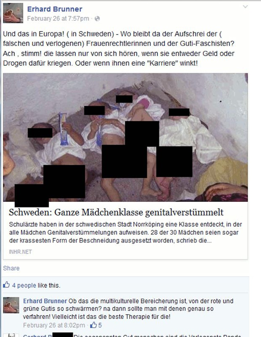 Der "Standard" hatte von Postings des Lokalpolitikers unter einem Foto von blutverschmierten - angeblich genitalverstümmelten - Säuglingen ("Wenn nur die Gutmenschen-Weiber auch so 'islamisiert' würden! Ob die dann weniger deppert und dafür denkfähiger wären????") ebenso wie von islamophoben und rassistischen Inhalten auf der Facebook-Seite des Mannes berichtet.