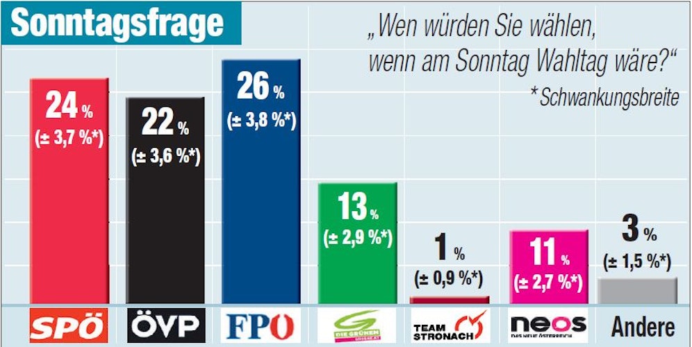 Der Ausgang der Steuerdebatte kann etwa ausschlaggebend sein, ob Rot- Schwarz die Mehrheit behält und Strache tatsächlich Erster wird. Die Grünen können ihr Ergebnis aus 2013 um 1,4 % verbessern, die Neos würden sich von 5 auf 11% mehr als verdoppeln. Das Team Stronach fliegt mit 1% raus .