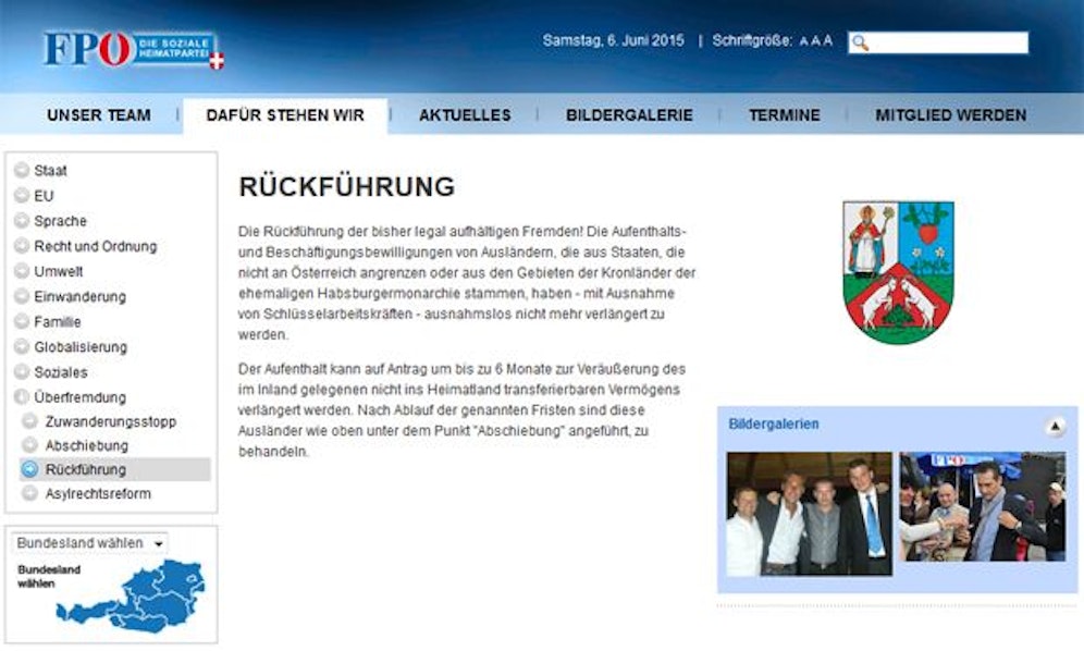 Einmal mehr herrscht Aufregung um die FPÖ Landstraße: Nachdem Partei-Anhänger erst kürzlich mit Schildern vor den Augen von kleinen Flüchtlingskindern gegen die Unterbringung eben dieser in der ehemaligen Zoll-Schule in Erdberg aufmarschierten, sorgt nun ihre Homepage für Entsetzen. Darauf wird die "Rückführung der bisher legal aufhältigen Fremden" gefordert.