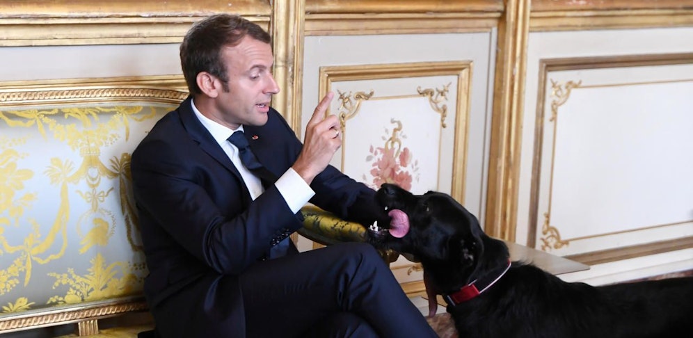 Jetzt leistete sich der Vierbeiner live vor den Kameras einen ganz besonderen Fauxpas, der auch Emmanuel Macron peinlich war.