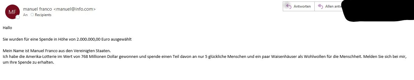 Ein nettes Mail von dem Amerikaner Manuel Franco erreichte eine Angestellte aus Amstetten. Darin stand, dass er in der Lotterie gewonnen hätte und er nun einen Teil seines Gewinnes an diverse Leute spenden würde. Auch die 56-Jährige sollte zu den glücklichen Gewinnern zählen. Franco würde ihr 2.000.000 Euro spenden - wenn sie sich bei ihm meldet.
