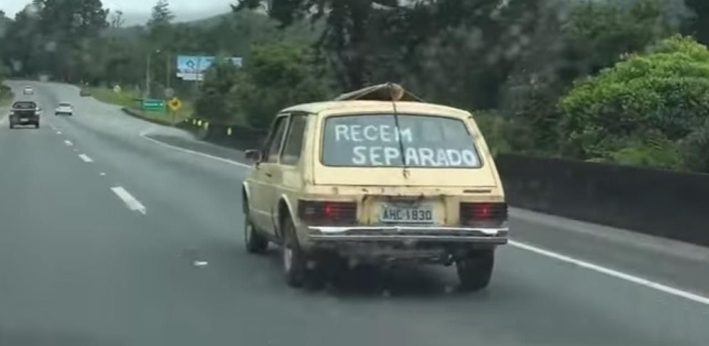 Mit einem alten rostigen Auto, dass auf der Heckscheibe die Aufschrift "FRISCH GESCHIEDEN" trägt, fährt ein junger Mann eine Landstraße in Brasilien entlang. Als ihn ein Auto überholt, hält die Beifahrerin den lustigen Moment auf Video fest: Der offensichtlich geschiedene Mann ist voller Freude und jubelt hinter dem Lenkrad seiner Schrottkiste. Der lebende Beweis dafür, dass man sich nicht unterkriegen lassen sollte, egal wie aussichtslos die Lage zu sein scheint.