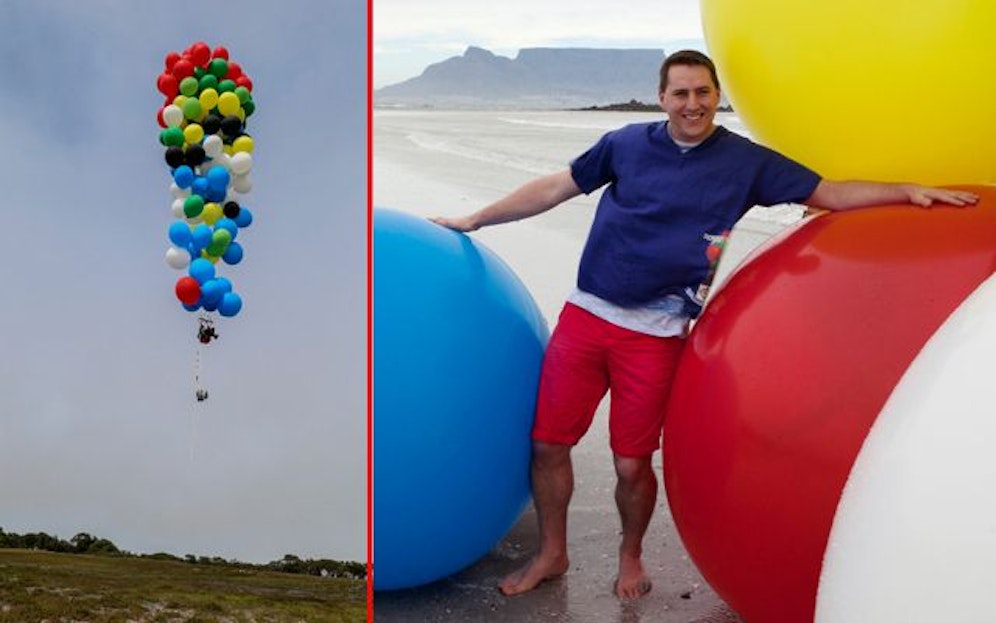 160 Heliumballons waren notwendig, dass Matt Silver-Vallance am Samstag abhob. Für den guten Zweck schwebte der Südafrikaner über die Meerespassage zwischen der früheren Gefängnisinsel Robben Island und Kapstadt.