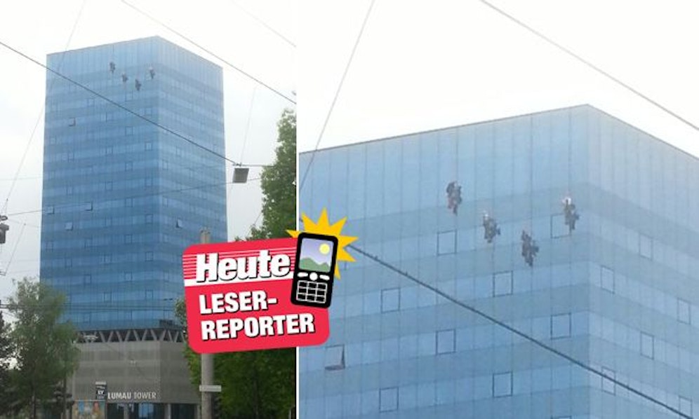 Dunkle Silhouetten, die sich aus schwindelerregender Höhe an der Glasfassade eines Hochhauses abseilen - bei diesem Bild denkt man schnell an "Mission: Impossible". Tatsächlich knipste Leserreporter Klaus Schuster am Blumau Tower in Linz "nur" Fensterputzer.
