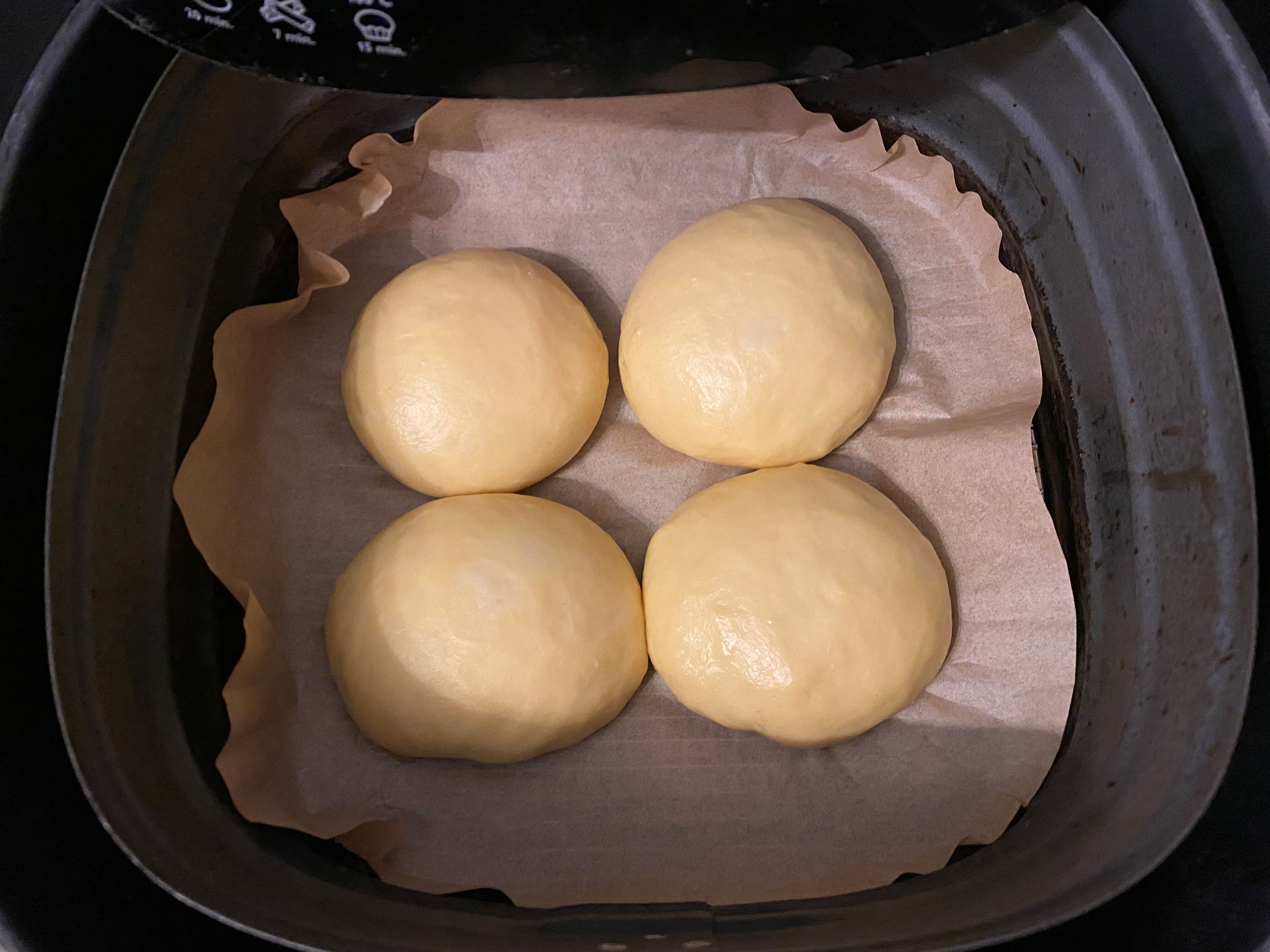 Den Teig noch einmal durchkneten und in etwa 12 gleich große Portionen teilen. Jedes Teigstück zu einer Kugel formen. Maximal vier Krapfen auf Airfryer-Backpapier geben und zugedeckt weitere 30 Minuten gehen lassen.