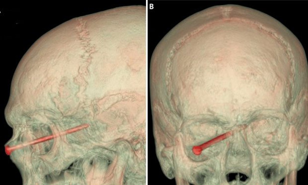 Der Metallkörper verletzte allerdings Arterien im Kopf des Mannes, wodurch das Sehvermögen des 27-Jährigen beeinträchtigt wurde. In einer komplizierten Operation wurde der Nagel entfernt werden, so dass keine bleibenden Schäden blieben.