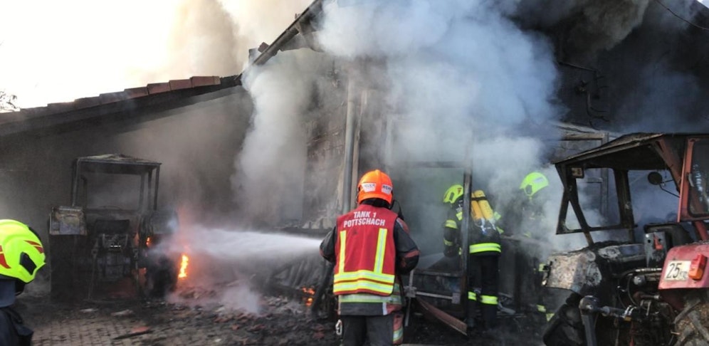 Bei Eintreffen der Feuerwehr stand das Gebäude in Vollbrand. Weiters brannten zwei Traktoren in voller Ausdehnung. Unter schweren Atemschutz gelang es der Feuerwehr, den Brand zu bekämpfen. Mittels Tanklöschfahrzeugen wurde Wasser zur Einsatzstelle transportiert. Weiters wurde mittels Pumpen eine Zubringerleitung versorgt, welche vom Werkskanal Wasser entnahm.Im Zuge der Löscharbeiten wurden von der Feuerwehr zwei Gasflaschen geborgen und gekühlt, sowie ein Benzinkanister. Trotz des raschen und schnellen Einsatzes der Feuerwehren entstand am betroffenen Gebäude schwerer Schaden.
