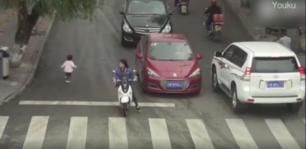 Sehen Sie das kleine Mädchen im rosa Pullover, ganz links im Bild? Sie befindet sich in China und wird gleich diese viel befahrene Straße überqueren.