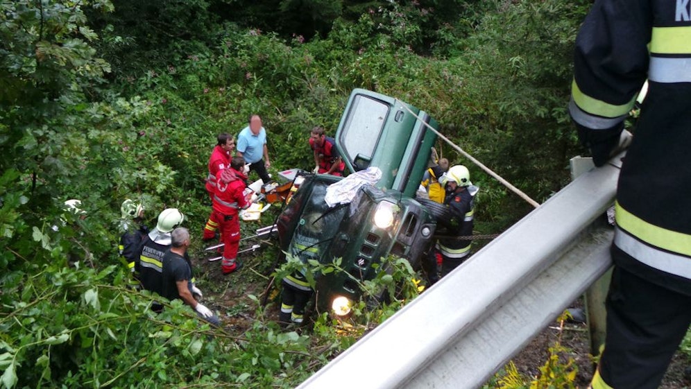 Der Lenker verlor gegen 18.30 Uhr auf einer Landesstraße plötzlich die Kontrolle über seinen Geländewagen, kam in weiterer Folge von der regennassen Fahrbahn ab, durchbrach ein Brückengeländer, stürzte folglich über eine steile Böschung und kam in einem Bachbett auf der Beifahrerseite zu liegen.