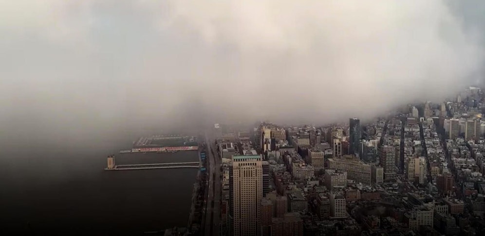 Twitter-Nutzer veröffentlichten Zeitraffer-Videos, die zeigen, wie sich die Sturmböe in die Wolkenkratzer hineinbewegt und diese anschließend komplett einhüllt.