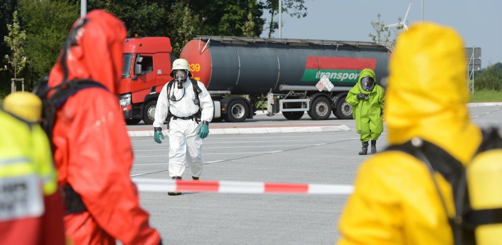 Die Einsatzkräfte lösten Umweltalarm aus, die ganze Rastststation und ein Teil der vorbeiführenden Bundesstraße wurde großräumig gesperrt.