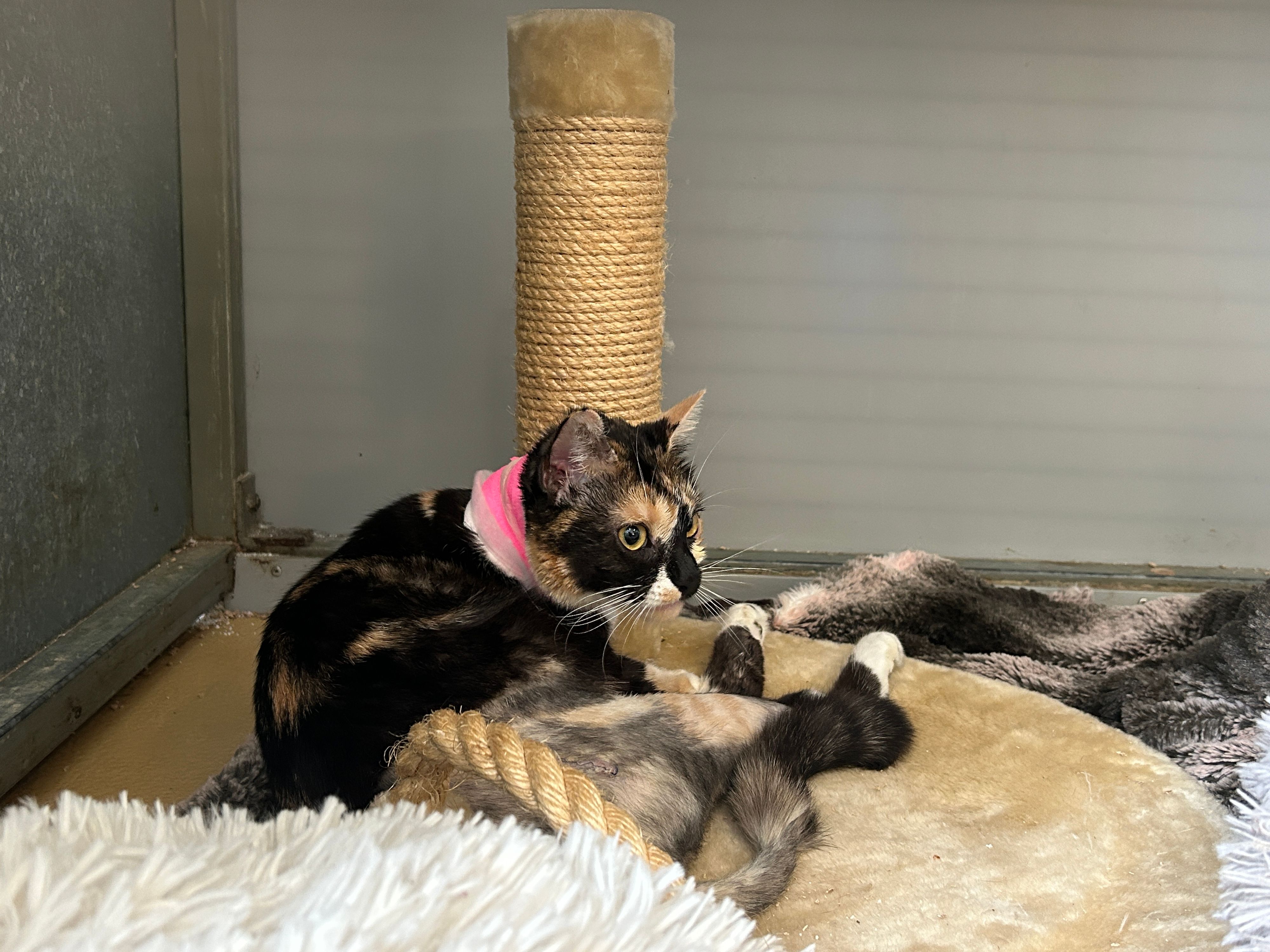 Nur dank sehr aufmerksamer Tierfreunde, konnte die dreifarbige Glückskatze "Kiwi" mit schweren Verletzungen gefunden und zur Vetmed gebracht werden. Leider war der Zustand der Schildpatt-Katze aber wesentlich ernster als gedacht und die Kosten für die Retter untragbar. Tierschutz Austria allerdings konnte dank des "Notfellchens-Programm" die OP-Kosten übernehmen und "Kiwi" befindet sich aktuell auf dem Weg der Besserung.