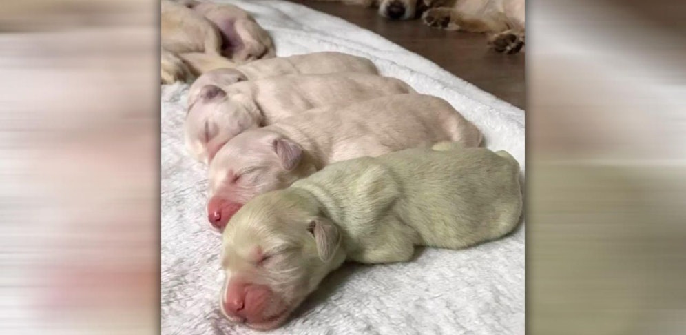 Ganze neun Welpen brachte eine Golden-Retriever-Hündin in der vergangenen Woche zur Welt. Ihre Besitzerin wurde dabei ein wenig überrascht. Und zwar nicht unbedingt wegen der Anzahl der Babys, sondern wegen einem der Neugeborenen. Der hatte nämlich ein grünes Fell.