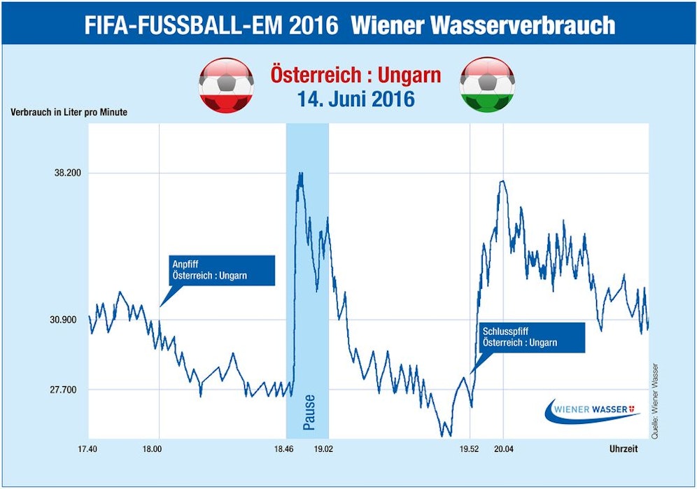 Spannend war das Fußballmatch Österreich gegen Ungarn, auch wenn Alaba & Co. am Schluss nichts zu Jubeln hatten. Eine witzige Grafik von Wiener Wasser zeigt, wie sich das Match aufs WC-Verhalten der Wiener auswirkte.