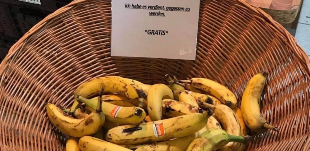 Die Nachricht prangt an einem Korb voller reifer Bananen. "Nimm mich bitte mit, Du musst auch nichts dafür bezahlen", heißt es auf dem Zettel. Und weiter: "Ich habe es verdient, gegessen zu werden."