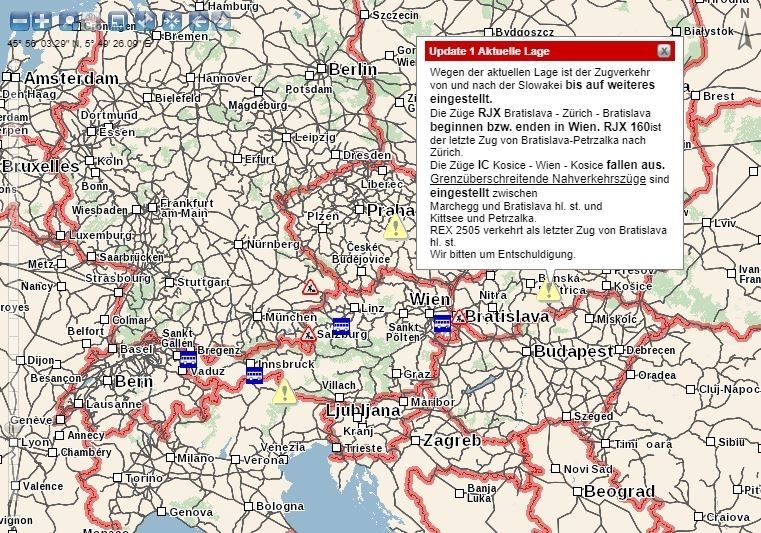 Auf der Homepage der ÖBB werden aktuell nur Fehlermeldungen bei Bahnhöfen in Italien, Tschechien und der Slowakei angezeigt. Auch das tschechische Unternehmen Regio.Jet stellt vorerst den Zugverkehr ein, wurde mitgeteilt.