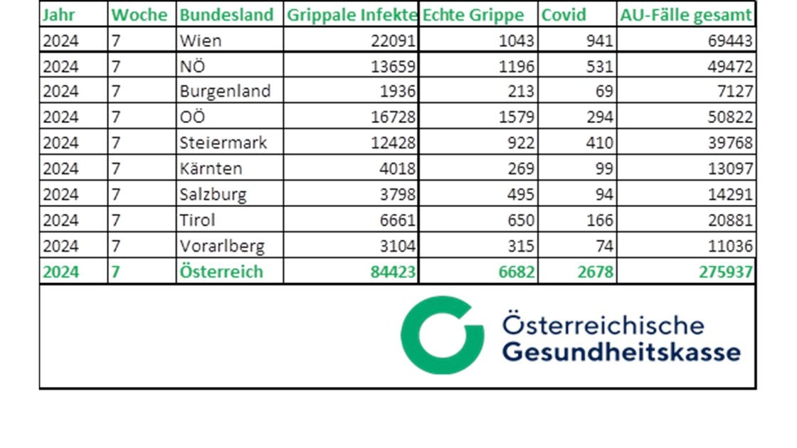 „Erneut ist die Zahl der Krankenstände bei allen drei Erkrankungen – Grippe, grippalen Infekten und Covid-19 – im Vergleich zur Vorwoche gesunken. Dennoch sind aktuell über 90.000 Menschen aufgrund eines grippalen Infekts oder der echten Grippe im Krankenstand.“