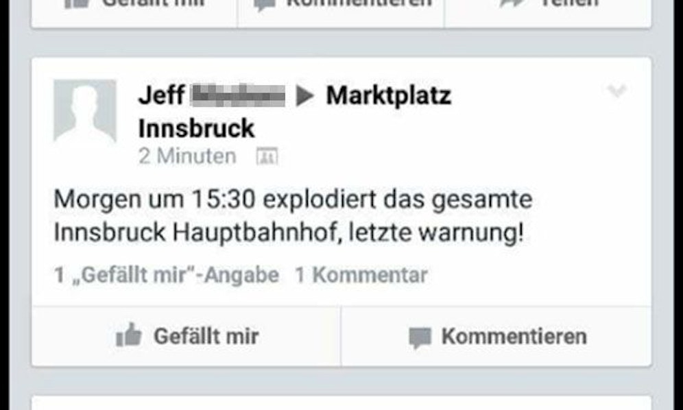 "Morgen um 15:30 explodiert das gesamte Innsbruck Hauptbahnhof, letzte warnung!" Mit diesem Eintrag in die Facebookgruppe "Marktplatz Innsbruck" löste ein User großes Aufsehen in Tirol aus. Zahlreiche "Life Radio Tirol"-Hörer leiteten dem Sender das Posting weiter, um via Radio eine Warnung rauszugeben.