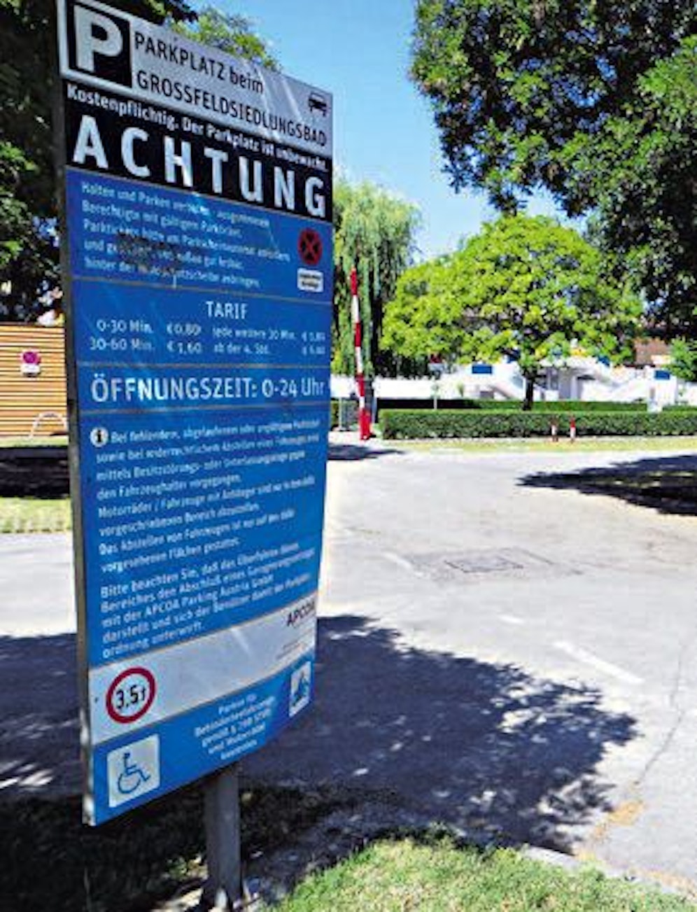 Der große Parkplatz vor dem Großfeldsiedlungsbad (Floridsdorf) ist kostenpflichtig. Wer länger als vier Stunden parkt, muss 6,40 hinlegen. Doch der Versuch zu kassieren, ist gründlich schiefgegangen
