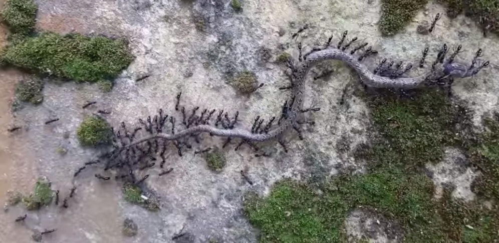 Eine ganze Armee aus Ameisen stürzte sich auf das wehrlose Reptil. Die Schlange hatte keine Chance – ein Wanderer hielt den Todeskampf auf Video fest.
