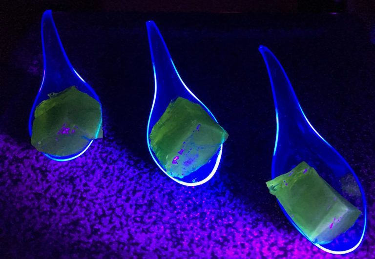 Mit dem Backpapier aus der Form heben, in Würfel schneiden und auf Fingerfood-Löffeln unter UV-Licht anrichten.