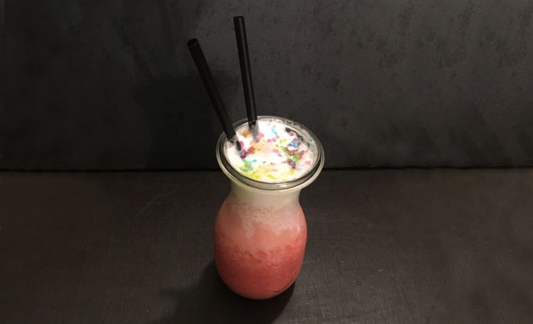 Alle Zutaten mit Crashed Ice in einen Krugmixer geben und gut druchmixen. In ein Glas füllen. Anschließend mit leicht geschlagener Kokosmilch und bunten Streuselzucker garnieren.