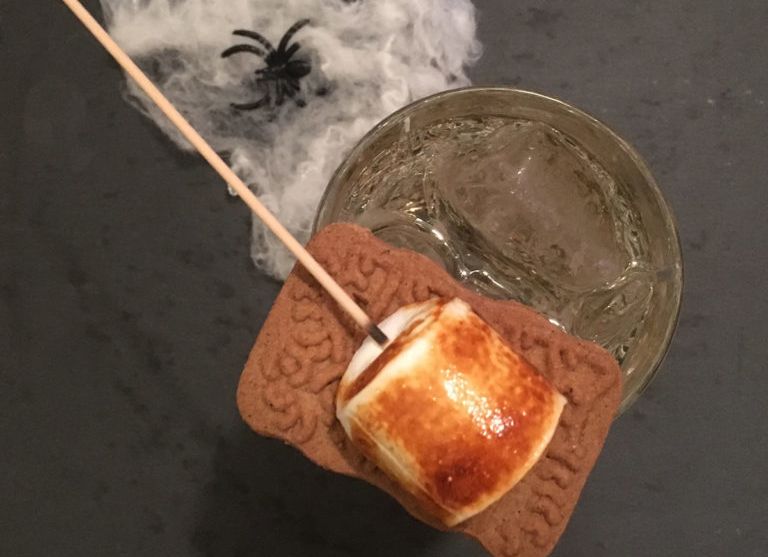 Haselnuss-Spirituose in ein Longdrinkglas mit Eis gießen. Mit ca. 10 cl Tonic auffüllen. Vorsicht mit einem Löffel einmal durchheben. Mit einem Spekulatius-Keks und einem aufgespießten, geflämmten Marshmellow garnieren.