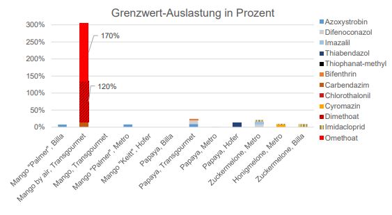 In neun der zwölf Proben wurden generell Pestizidrückstände gefunden. In sechs Früchten fand das Labor Pestizide, die in Europa nicht eingesetzt werden dürfen, weil sie zu gefährlich für Mensch und Natur sind. Besonders bedenklich: Auf einer Mango wurden zwei Pestizide deutlich über dem jeweiligen Grenzwert der Europäischen Union gefunden. Dabei handelt es sich um Dimethoat und Omethoat.
