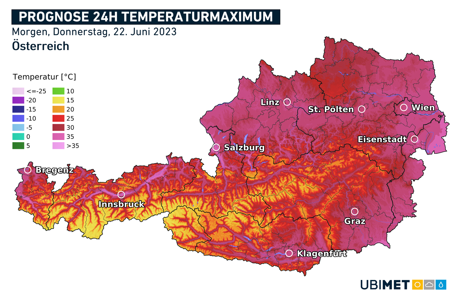 Der Sonntag hat erneut viel Sonnenschein zu bieten, durchziehende Wolkenfelder bleiben meist harmlos. Nur von den Hohen Tauern bis ins Mariazellerland können die Wolken auch etwas hartnäckiger ausfallen, es bleibt aber verbreitet freundlich und meist trocken. Bei nur mehr schwachem bis mäßigem Nordwestwind steigen die Temperaturen auf 23 bis 31 Grad, mit den höchsten Werten von Vorarlberg bis nach Oberkärnten.