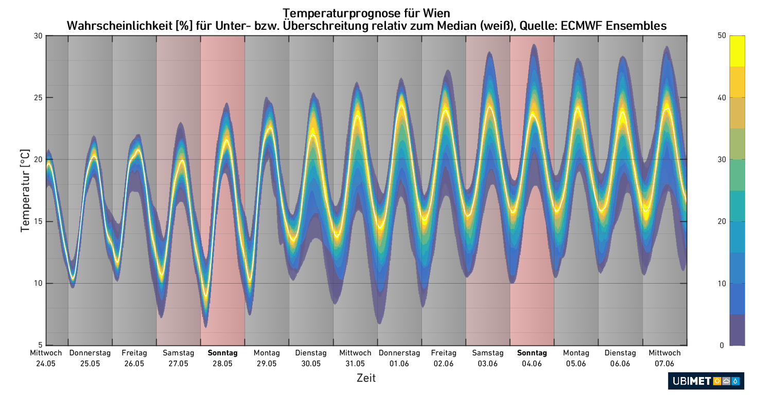 Am Pfingstwochenende dominiert im ganzen Land der Sonnenschein, wenn überhaupt machen sich über den Bergen Quellwolken bemerkbar. Dazu bleibt es im Großteil Österreichs auch das gesamte Wochenende hinweg trocken, selbst über den Bergen bleibt die Schauerneigung gering. Die Temperaturen präsentieren sich dabei perfekt für jegliche Aktivitäten im Freien – nicht zu kühl und nicht zu heiß. Die Temperaturen erreichen 19 bis 26 Grad mit den höchsten Werten in Tirol und Oberkärnten.