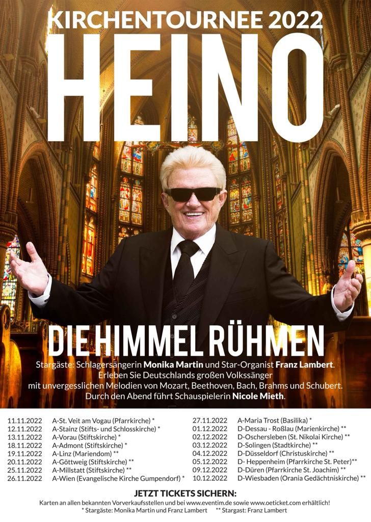Der Tourneestart erfolgt just an Faschingsbeginn, am 11. November, in der Pfarrkirche St. Veit am Vogau (Südsteiermark). Als Stargäste konnte Heino die steirische Schlagersängerin Monika Martin und Star-Organist Franz Lambert gewinnen.