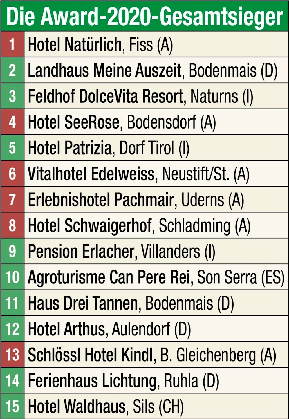 Was auffällt – und worauf wir stolz sein dürfen: Gleich sechs heimische Betriebe haben es unter die Top 15 in der Award 2020-Hitparade geschafft. Auch der Gesamtsieg geht nach Österreich – und zwar an das Tiroler Hotel Natürlich. Mehr dazu auf www.holidaycheck.de