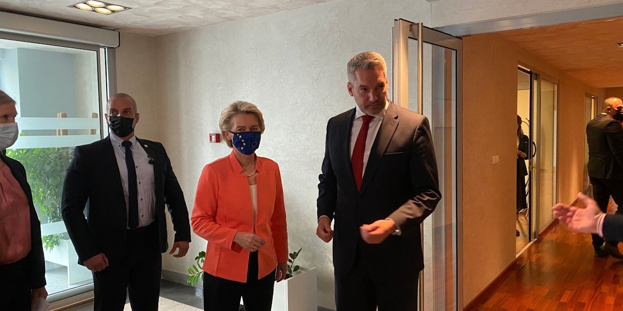 Ähnlich wie ÖVP-Innenminister Karl Nehammer reist EU-Kommissionschefin Ursula von der Leyen durch den Westbalkan. Der Reiseplan ist dabei noch ambitionierter als jener des Innenministers. Von der Leyen besucht sechs Länder in drei Tagen. Heute trifft sie den serbischen Präsidenten Aleksandar Vučić. Auf dem Weg nach Serbien legte die Präsidentin auch einen Zwischenstopp in Montenegro ein. Dabei kam es auf dem Flughafen von Podgorica zufällig zum Stelldichein zwischen Nehammer und von der Leyen.