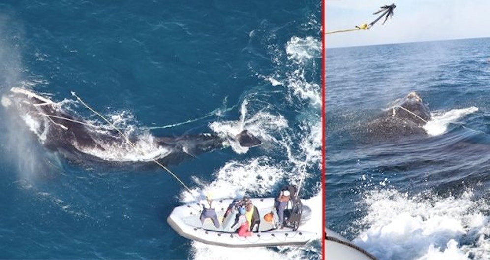 Am Tag darauf konnten die Meeresbiologen in einem Schlauchboot nahe an den Wal heranfahren. Mit einem eigens gebastelten "Enterhaken-Schneider" versuchten die Helfer, das dicke Fangseil durchzuschneiden, um den Meeressäuger so zu befreien.