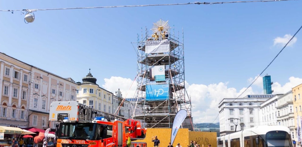 Schon seit Wochen ist die Dreifaltigkeitssäule am Linzer Hauptplatz mit einem meterhohen Gerüst gut "eingepackt".