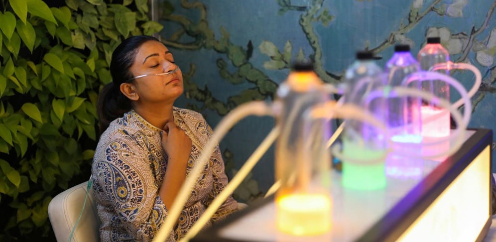 Eine Viertelstunde Luftschnappen kostet dort umgerechnet rund sechs Euro, eine enorme Summe für indische Verhältnisse. Auch hippe Luft-Cocktails werden ausgeschenkt – sie sollen laut Bar besonders gesund sein.