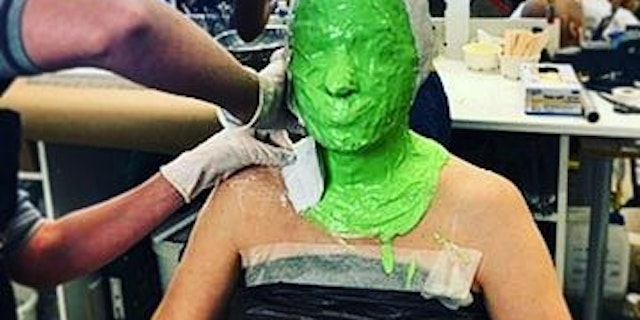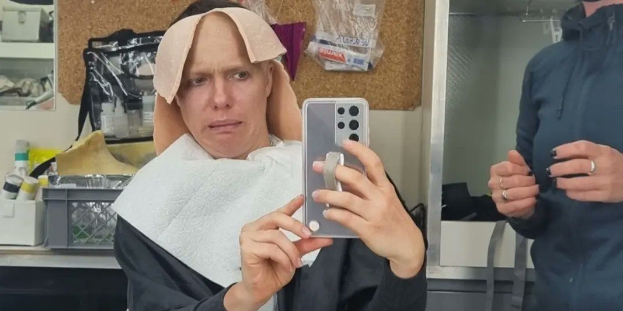 Die Lösung: Eine Spezialanfertigung (o.) sorgte zumindest visuell für Kahlschlag am Haupt der 35-Jährigen. Beim "Abschälen" der künstlichen Glatze entstanden die kuriosen Bilder, die Altenberger nun mutig auf Social Media teilte