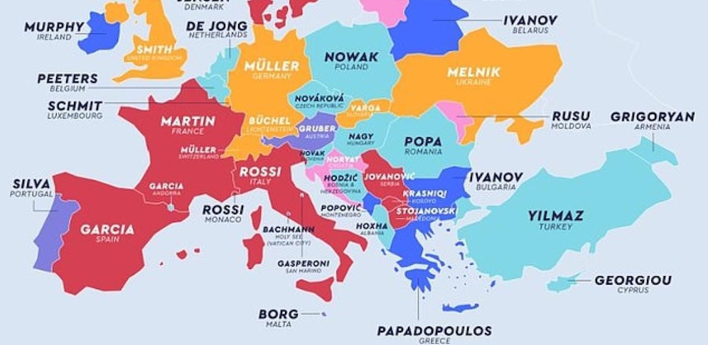Die Rechercheplattform Netcredit hat die häufigsten Nachnamen in Europa in einer Grafik dargestellt. So sind in Deutschland und in der Schweiz die Müllers weit verbreitet, Franzosen heißen mit der größten Wahrscheinlichkeit Martin.