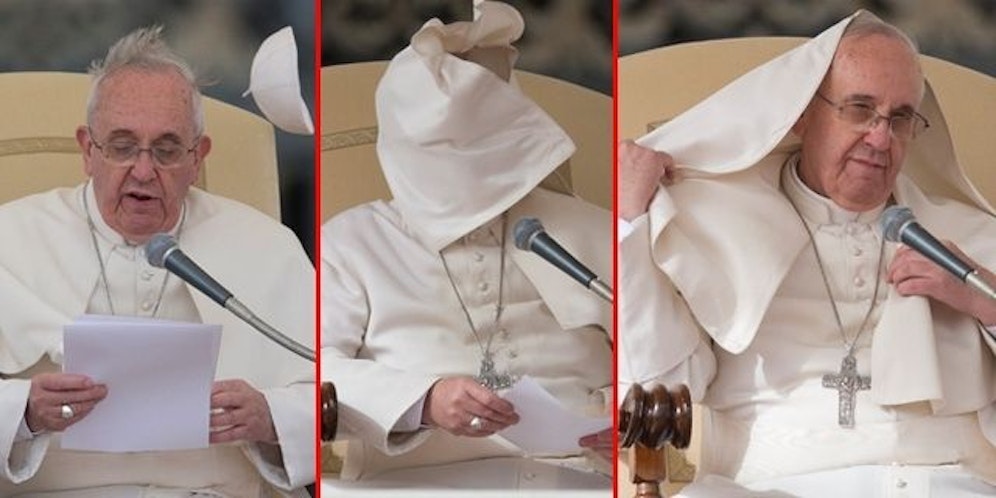 Während seiner Generalaudienz am Mittwoch wurde der Papst, seines Zeichens Nachfolger des Heiligen Petrus, Ziel eines Wetter-Streichs seines biblischen Vorgängers. Ein starker Wind wehte Franziskus das Käppchen vom Kopf und seinen päpstlichen Umhang ins Gesicht.