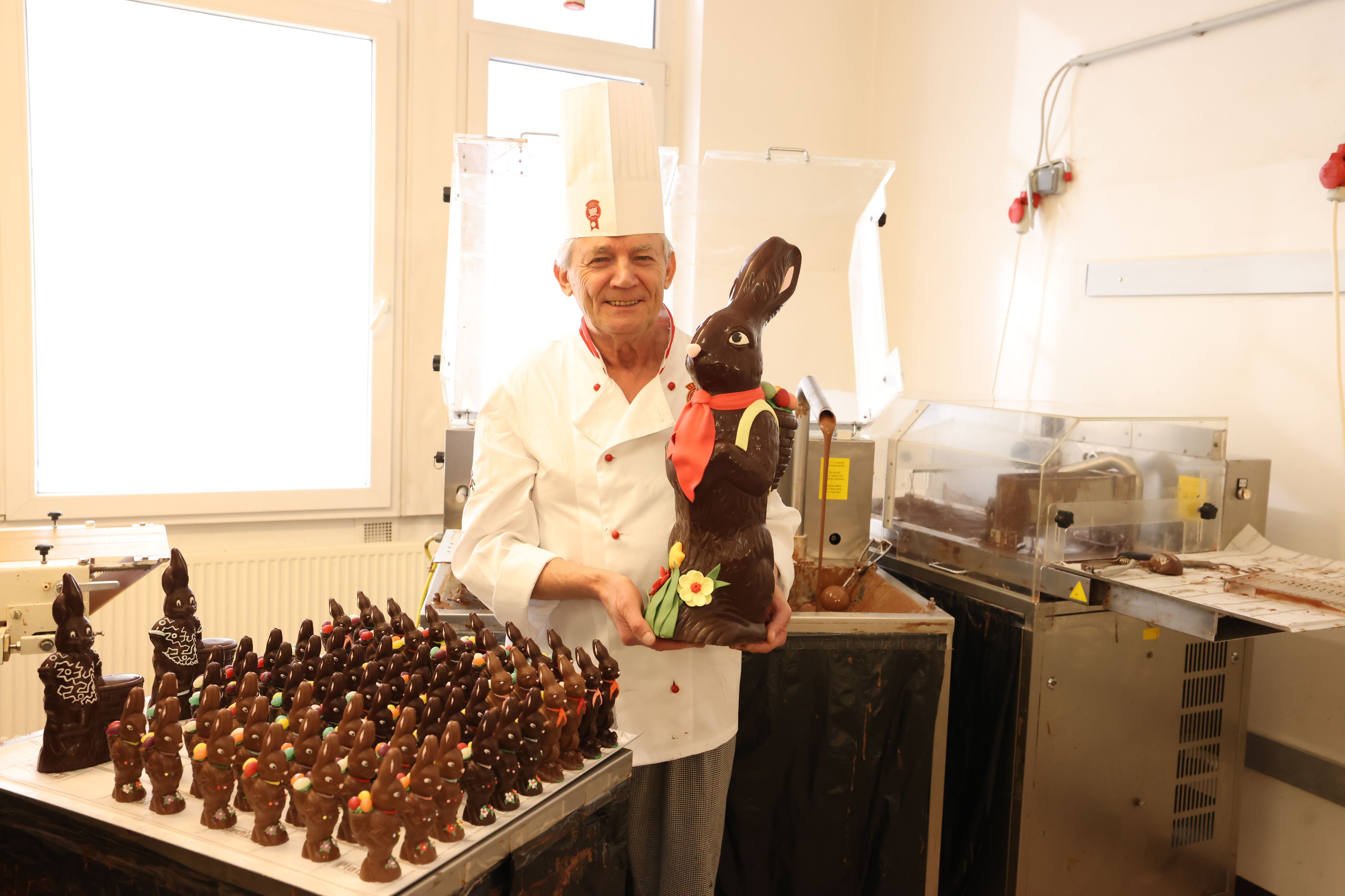 In Wien gibt es noch Schokohasen, die liebevoll per Hand hergestellt werden. So zum Beispiel in der Schokoladenmanufaktur von "Schokokönig" Wolfgang Leschanz in Wien-Mariahilf.